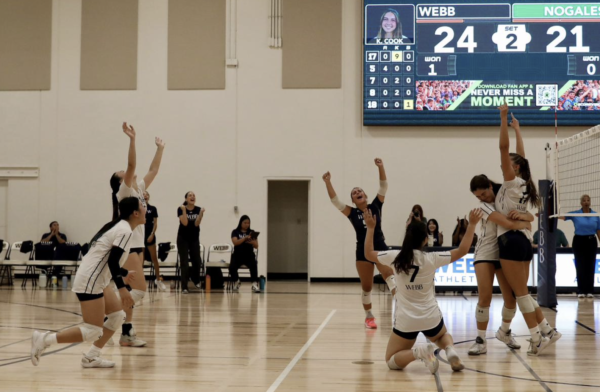 The team celebrates after Kate Cook (‘27) gets a point for the team, marking the first of many wins for the girls’ volleyball team. Though losing many talented players last year, the team is learning how to adapt quickly. With their impressive 16-2 record (8-0 in league) the girls have clearly found their balance.
